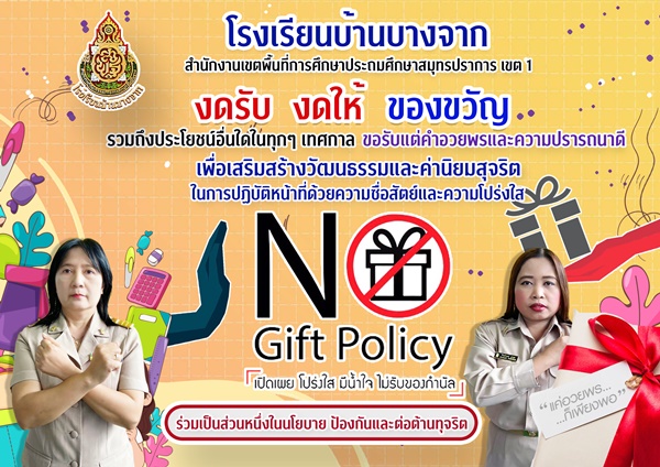 ประกาศโรงเรียนบ้านบางจาก เรื่อง นโยบายการไม่รับของขวัญและของกำนัลทุกชนิดจากการปฏิบัติหน้าที่ (No Gift Policy) ปีงบประมาณ 2566