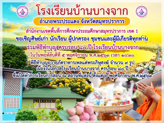 ขอเชิญศิษย์เก่า นักเรียน ผู้ปกครอง ชุมชนและผู้มีเกียรติทุกท่าน ร่วมพิธีทำบุญ ครบรอบ 80 ปี โรงเรียนบ้านบางจาก